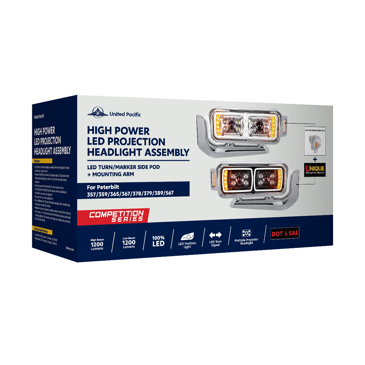 Peterbilt 10 LED Projection Headlight with 8 LED Turn, 100 LED Position Light Bar and 14 LED Side Marker Pod with Mounting Arm